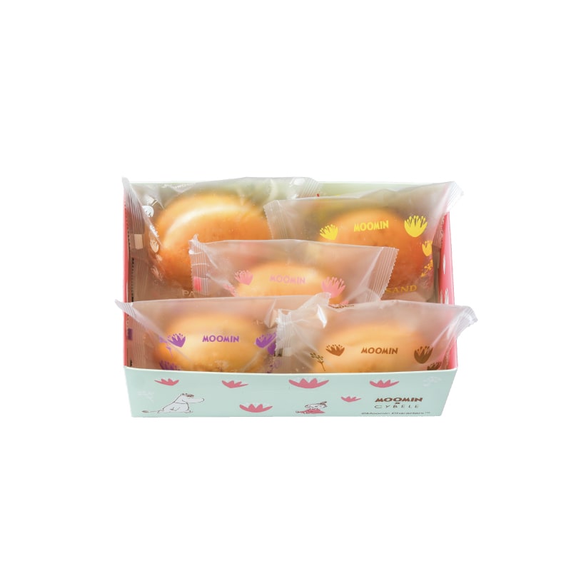 MOOMIN×シベールがコラボしたスイーツ「ムーミンパンケーキサンド」 スフレタイプのふわふわしっとりのパンケーキにクリームをたっぷりとサンドしました。スフレにはムーミンと仲間たちの焼印が!手のひらサイズで食べやすいスイーツ。5種類の味をセットでお届けします。