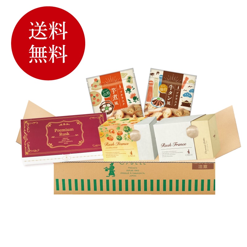 - ショコラカシューナッツ1枚入×6袋、プレミアムバター・パンプキン2枚入×6袋、プチラスク(山形芋煮風・牛タン風)バラ詰め60g ×各1袋