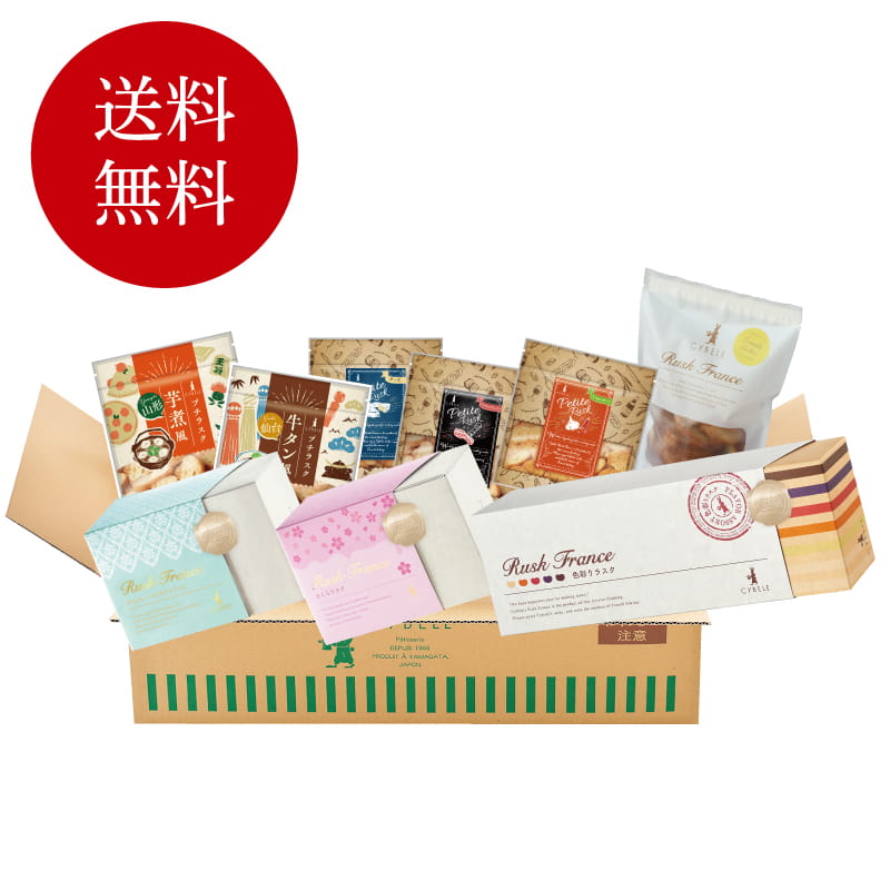 - チョコレートラスクアソート6袋入×1箱(ラスクル・つぶつぶ苺・ピスタチオ1枚入×2袋)、さくらラスク6袋入×1箱(1枚入×6袋)、 色彩りラスク12袋入×1箱(プレミアムバター2枚入×4袋、ブルーベリー・ショコラ・メープル+くるみ・ ガーリック2枚入×各2袋)、ザ・シンプルラスク バラ詰め130g×1袋、プチラスク(ベーコン ペッパー風・チーズ・ペペロンチーノ・山形芋煮風・牛タン風)バラ詰め60g入×各1袋