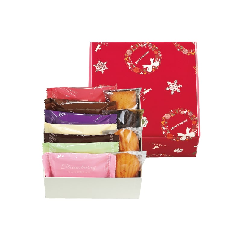 - つぶつぶ苺・ピスタチオ・ラスクル 1枚入×各1袋、プレミアムバター、ブルーベリー・ショコラ・メープル+くるみ 2枚入×各1袋、マドレーヌ 2個、マドレーヌショコラ・プレミアムフィナンシェ×各1個